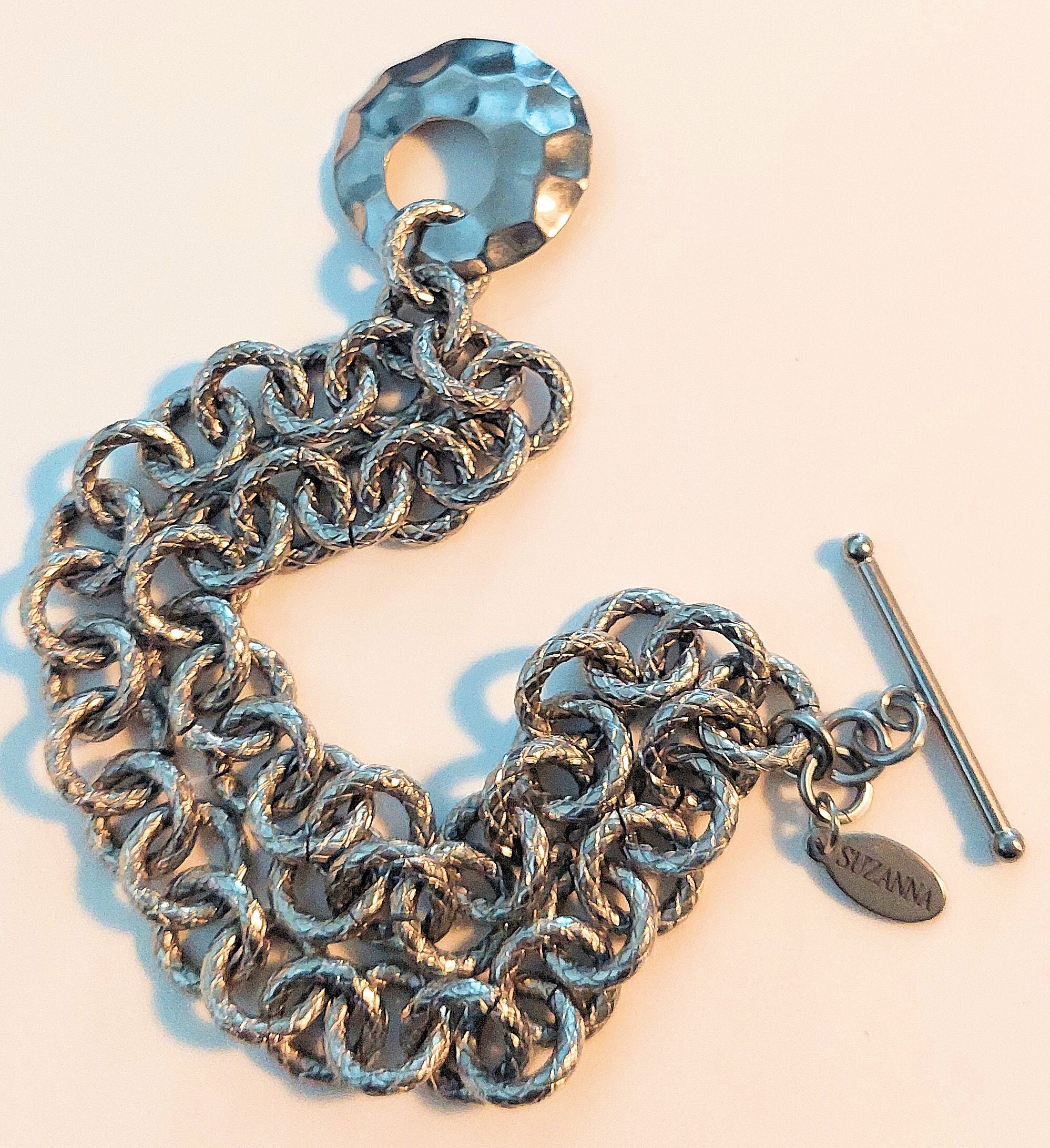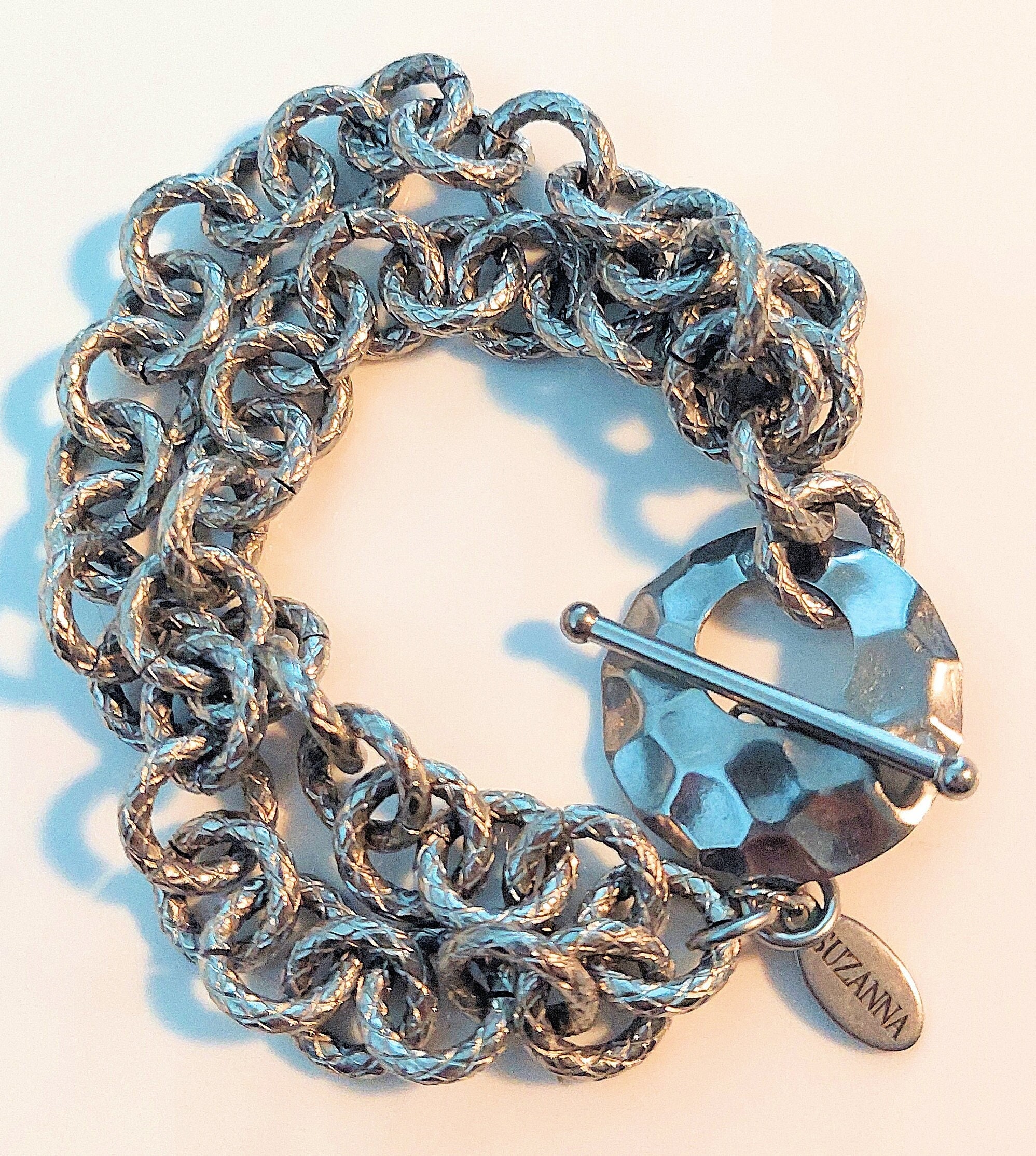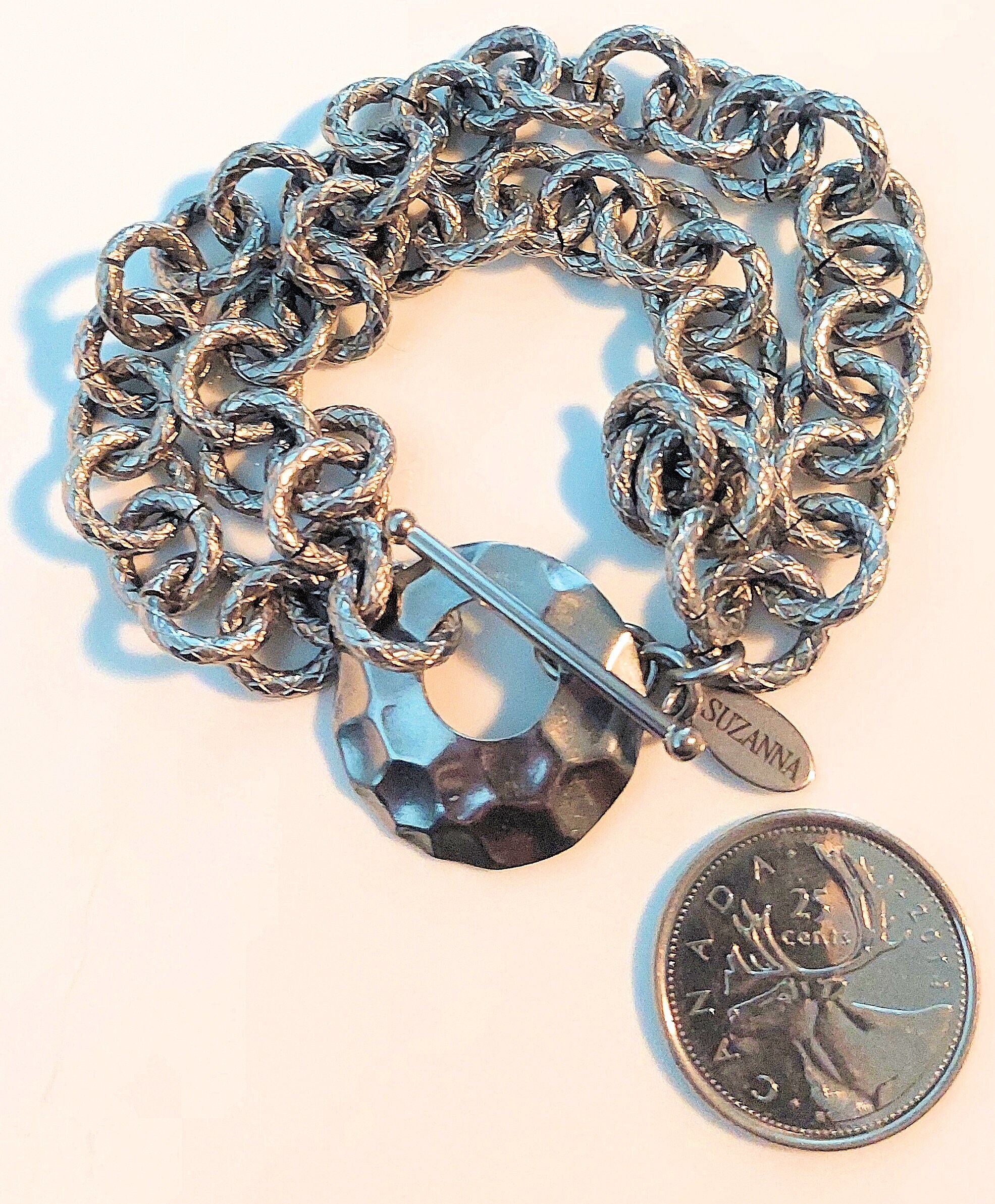 - The bracelet is finished with a hammered stainless steel toggle clasp.