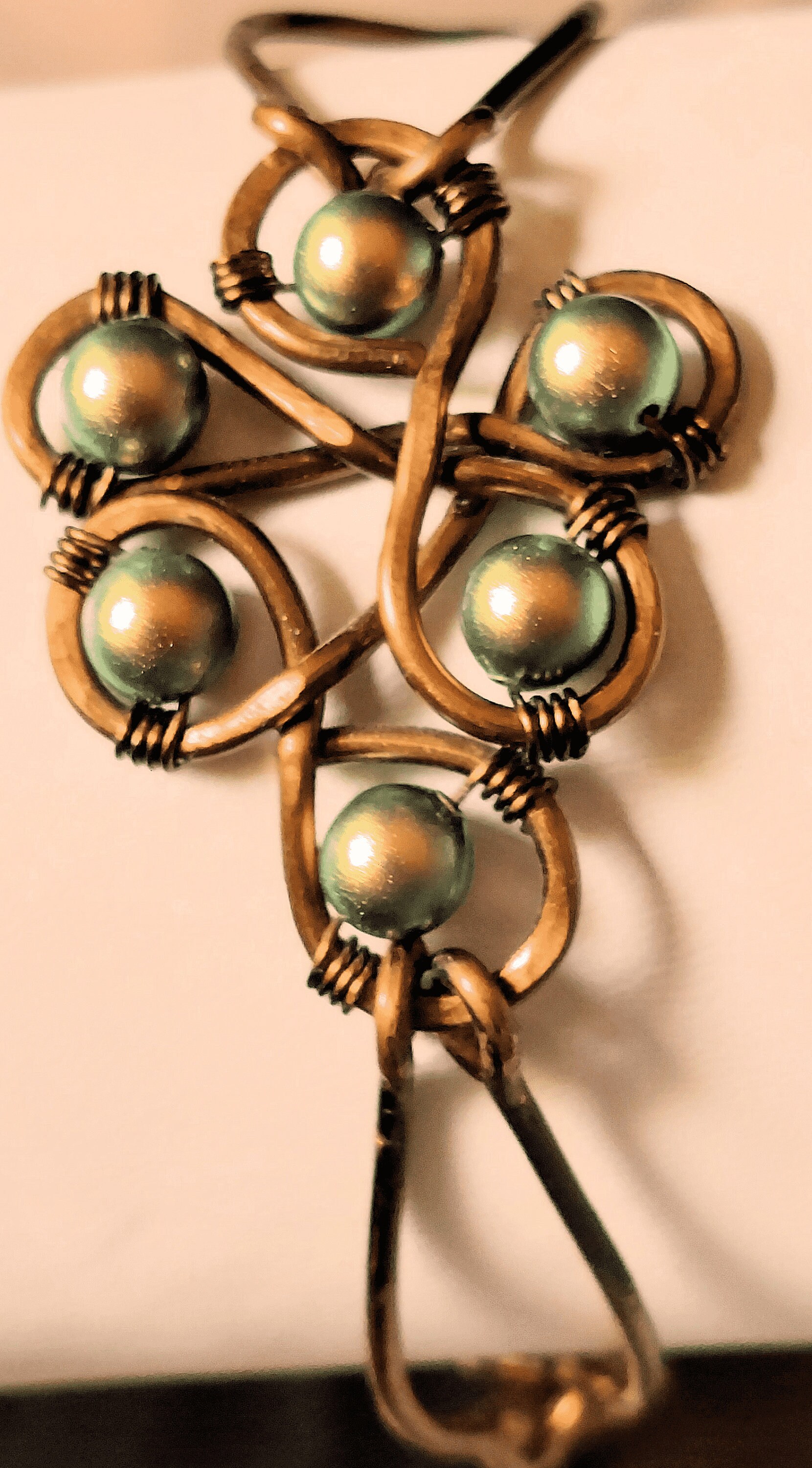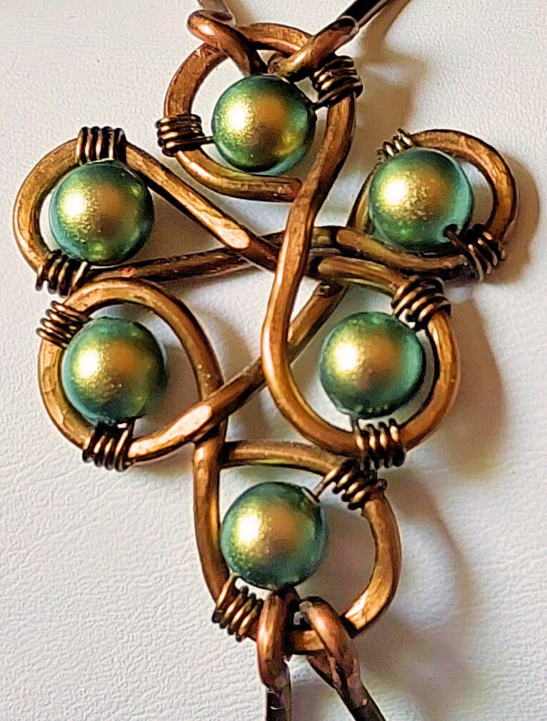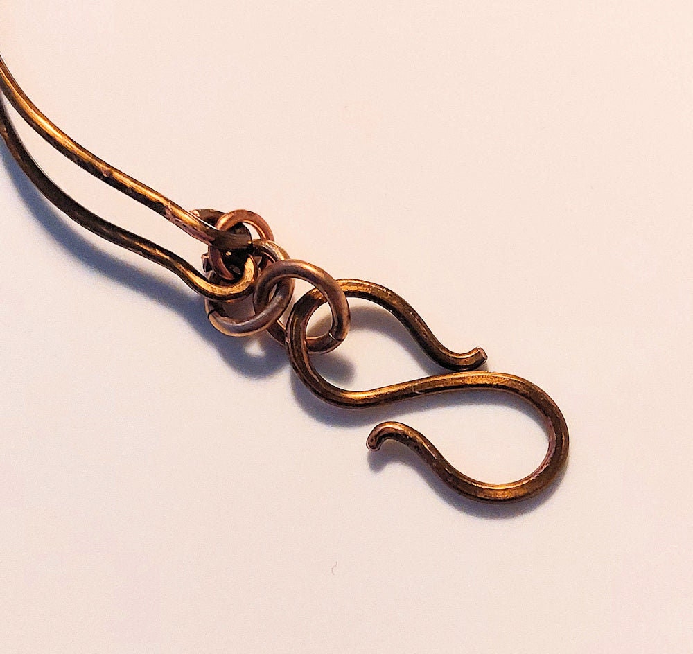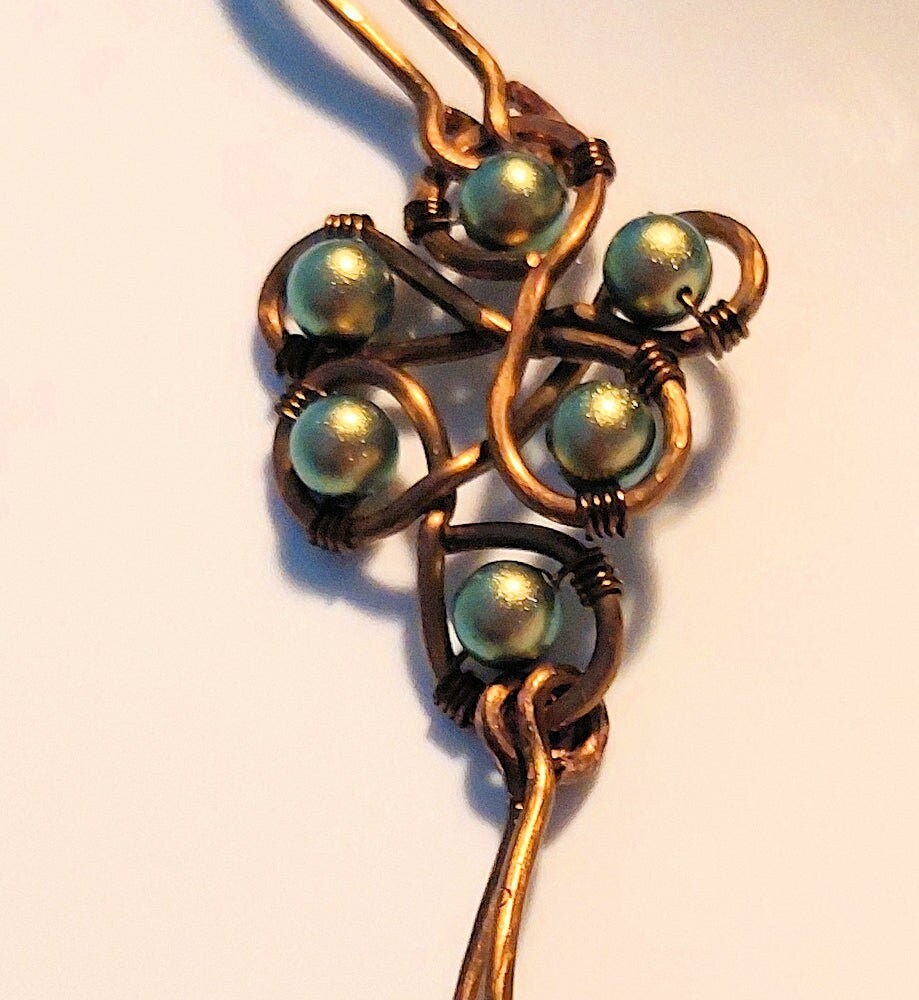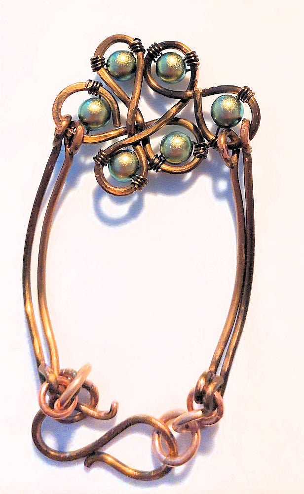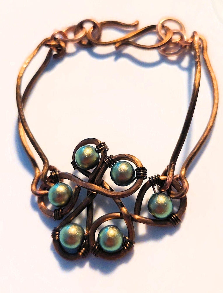 The focal freeform loop design is made with heavy gauge non-tarnish vintage bronze wire. The wire is worked into a graceful freeform design and given a hammered texture. Heavy gauge non-tarnish vintage bronze wire is formed into two adjoined bangles on each side of the focal and clasp, hammered for sturdiness, texture, and subtle sparkle, and joined to the bangles by copper and bronze jump rings. Six iridescent green Swarovski crystal pearls are wire-wrapped onto the focal loop design with vintage bronze wire. The handmade vintage bronze wire S hook clasp is hammered for texture.