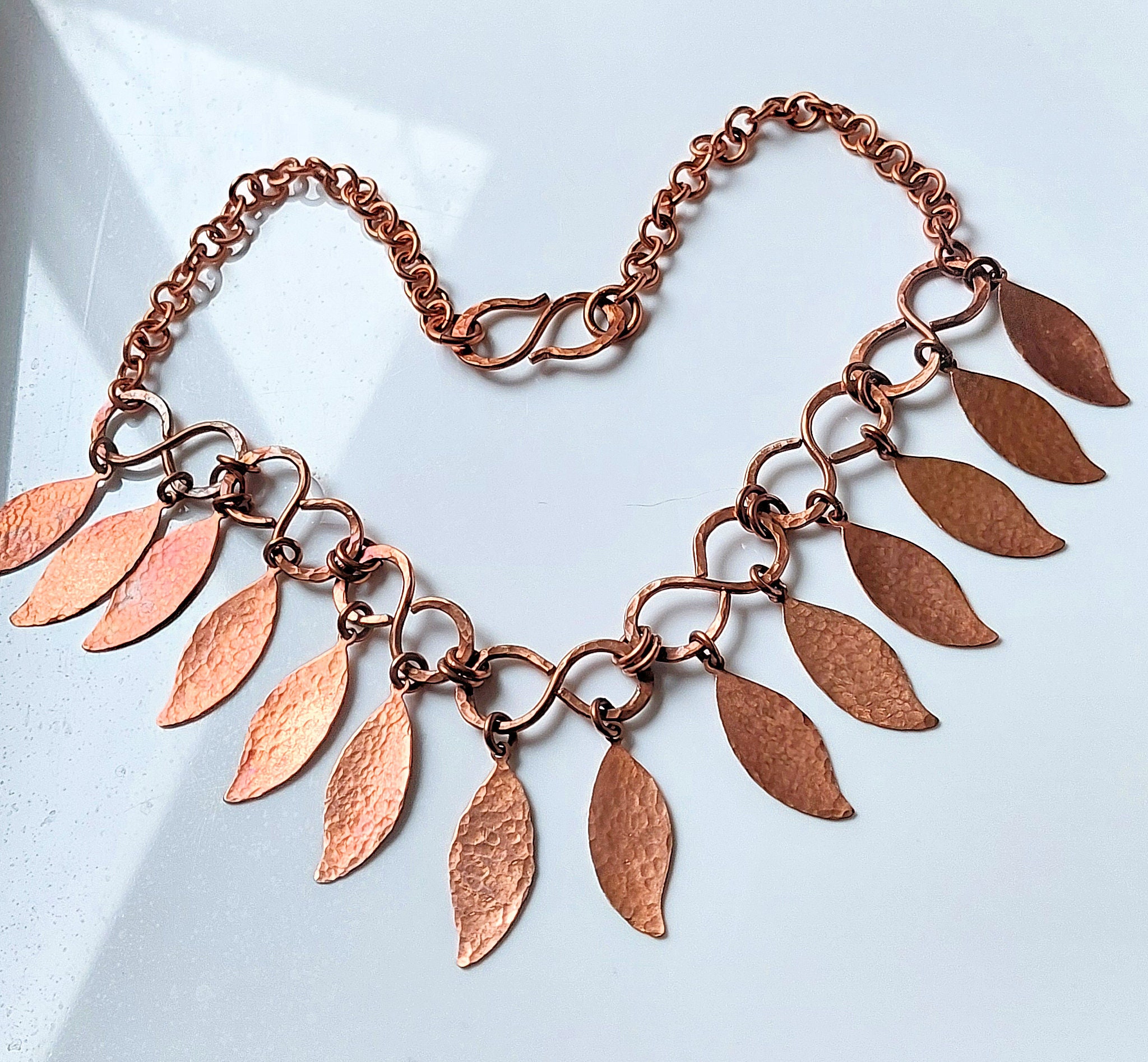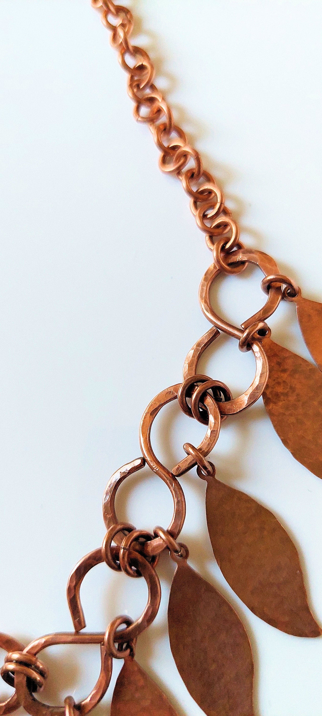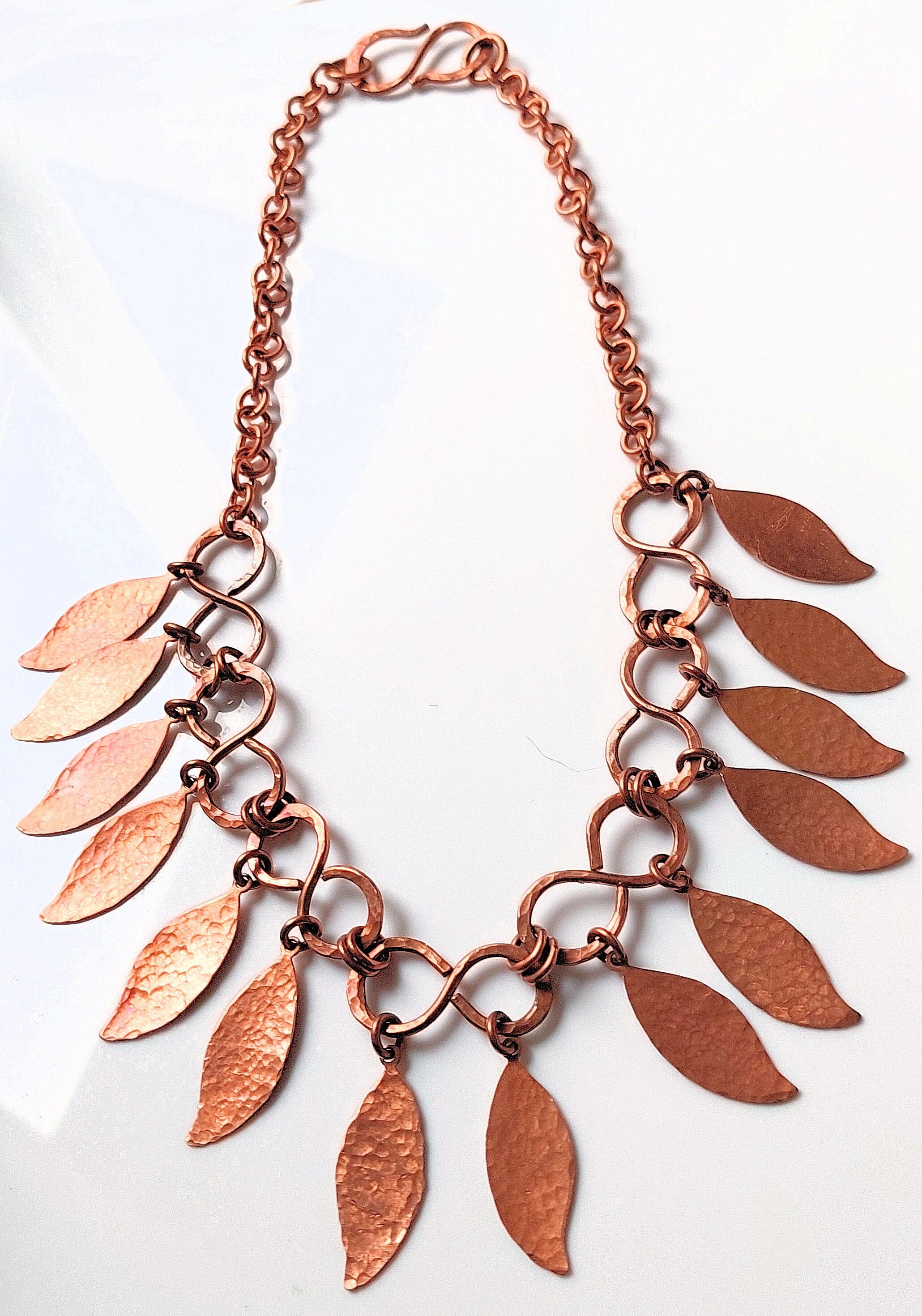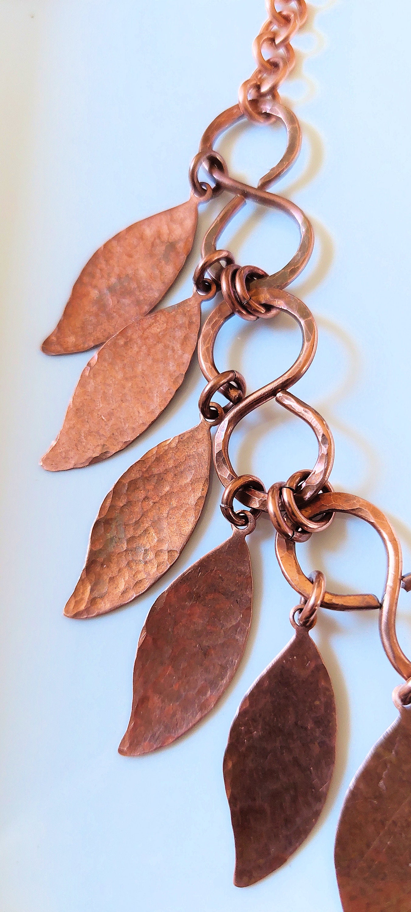 14 pretty copper leaf charms dance on a chain of seven infinity-shaped (figure 8) components handmade from heavy gauge copper, all hammered for sparkle and textural interest in this one-of-a-kind necklace. The handmade infinity chain and leaves showcase a rich natural patina contrasting the unoxidized 1-in-1 chain which will darken with time.