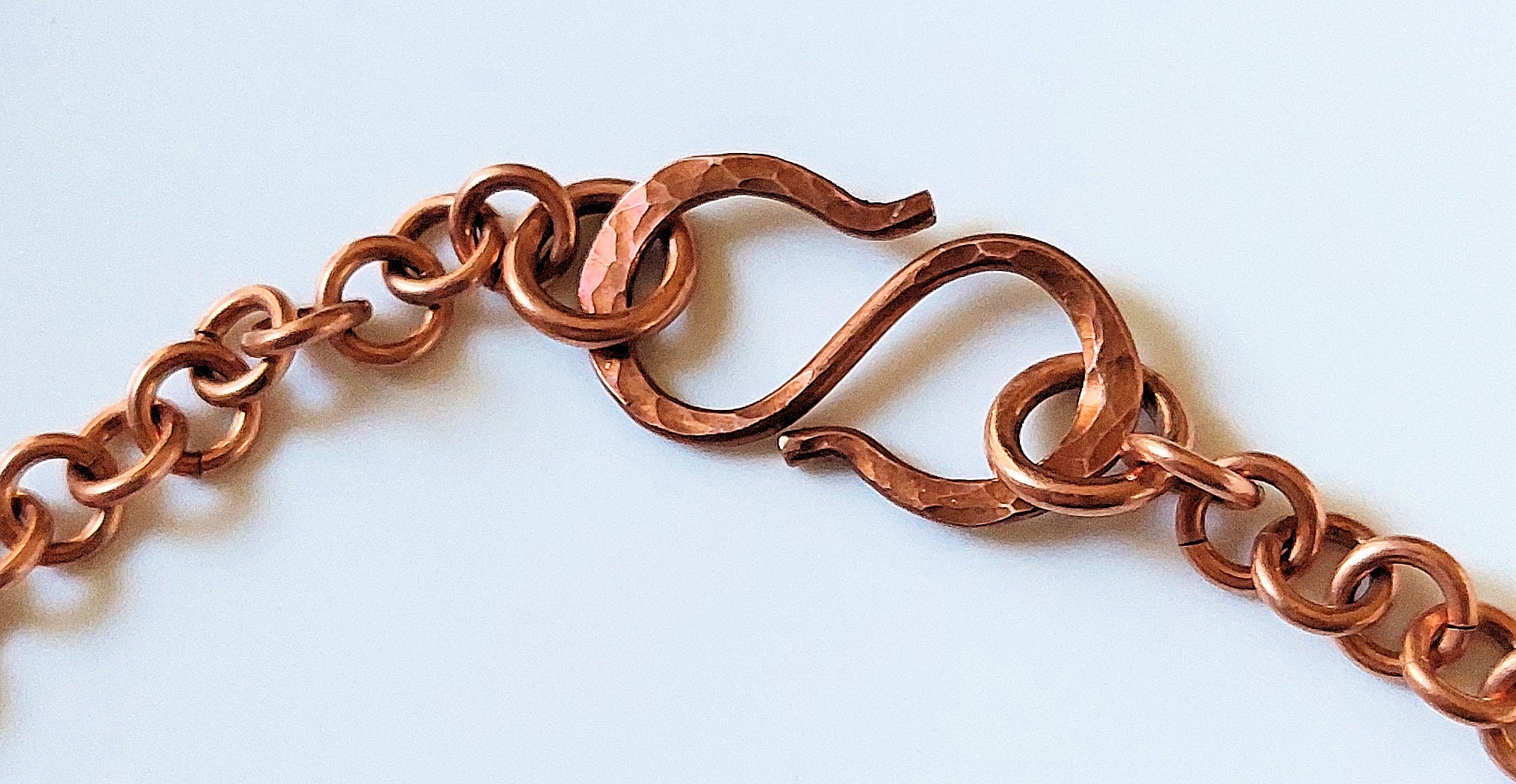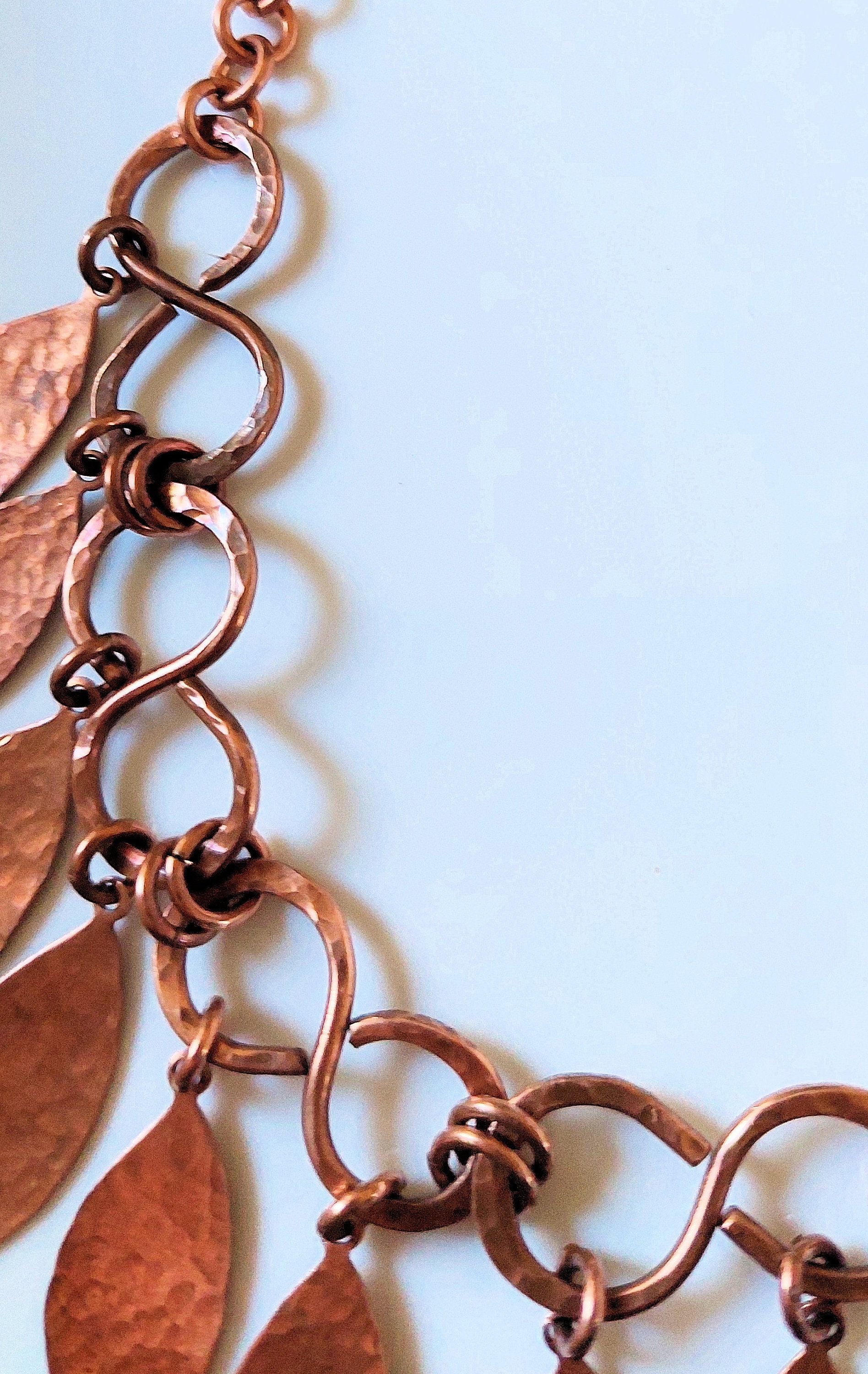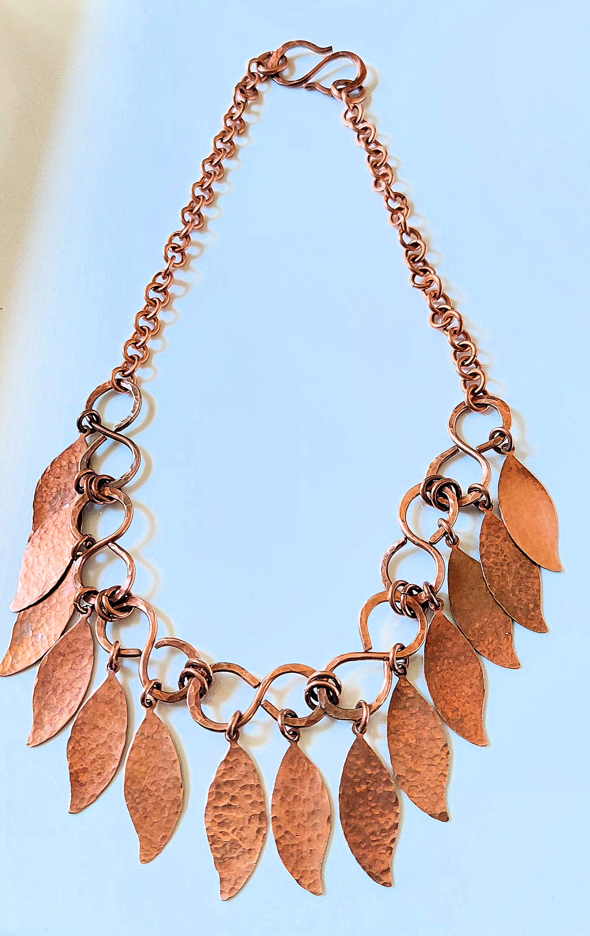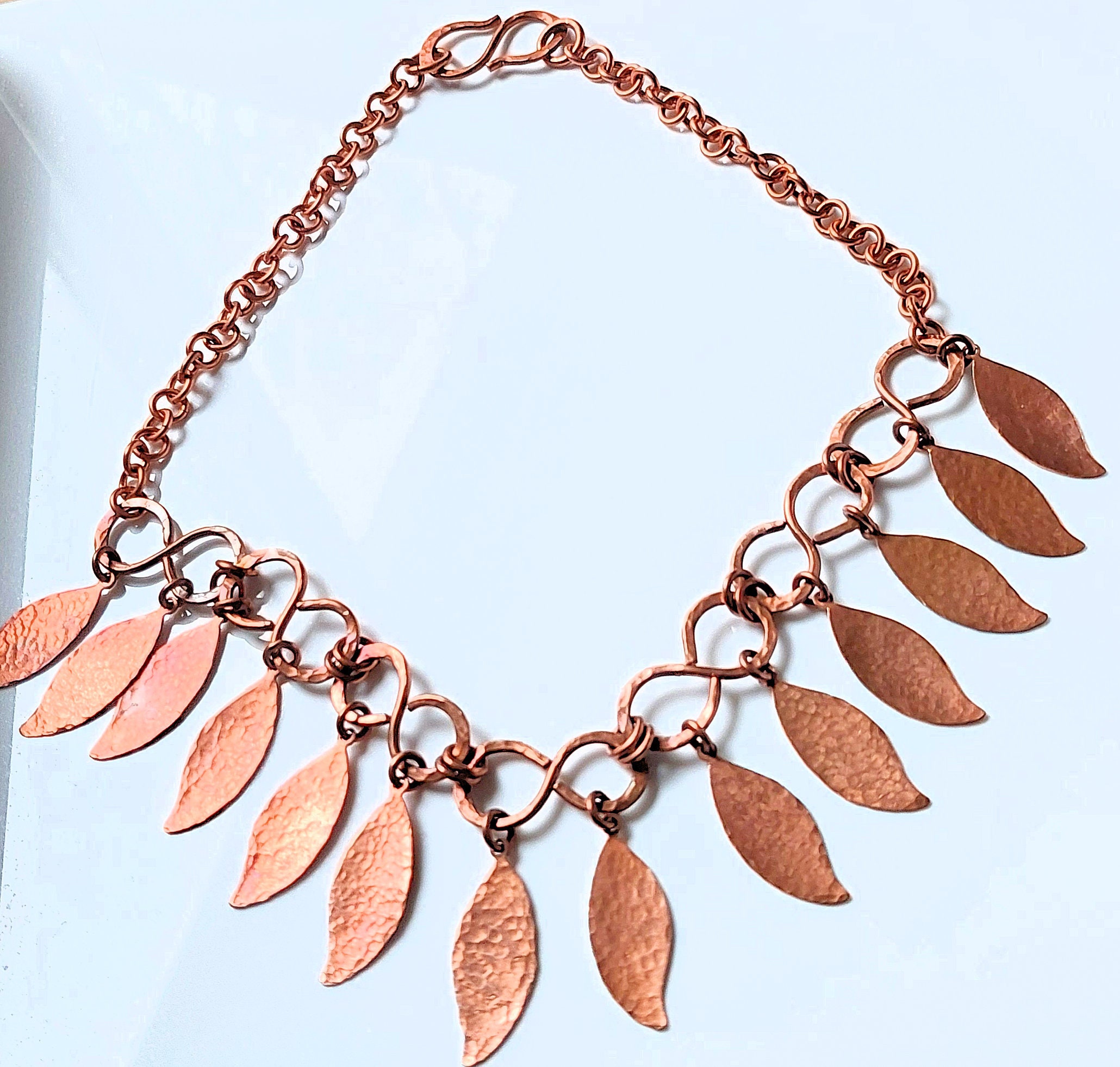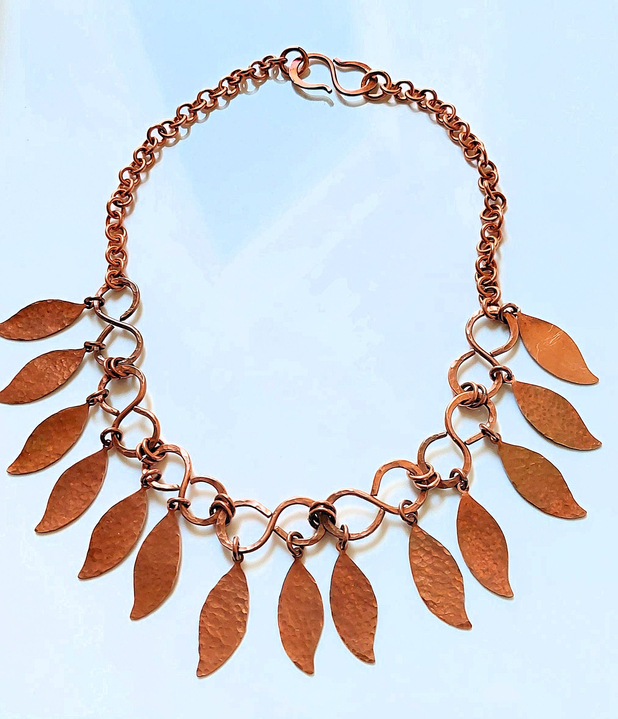 14 pretty copper leaf charms dance on a chain of seven infinity-shaped (figure 8) components handmade from heavy gauge copper, all hammered for sparkle and textural interest in this one-of-a-kind necklace. The handmade infinity chain and leaves showcase a rich natural patina contrasting the unoxidized 1-in-1 chain which will darken with time.