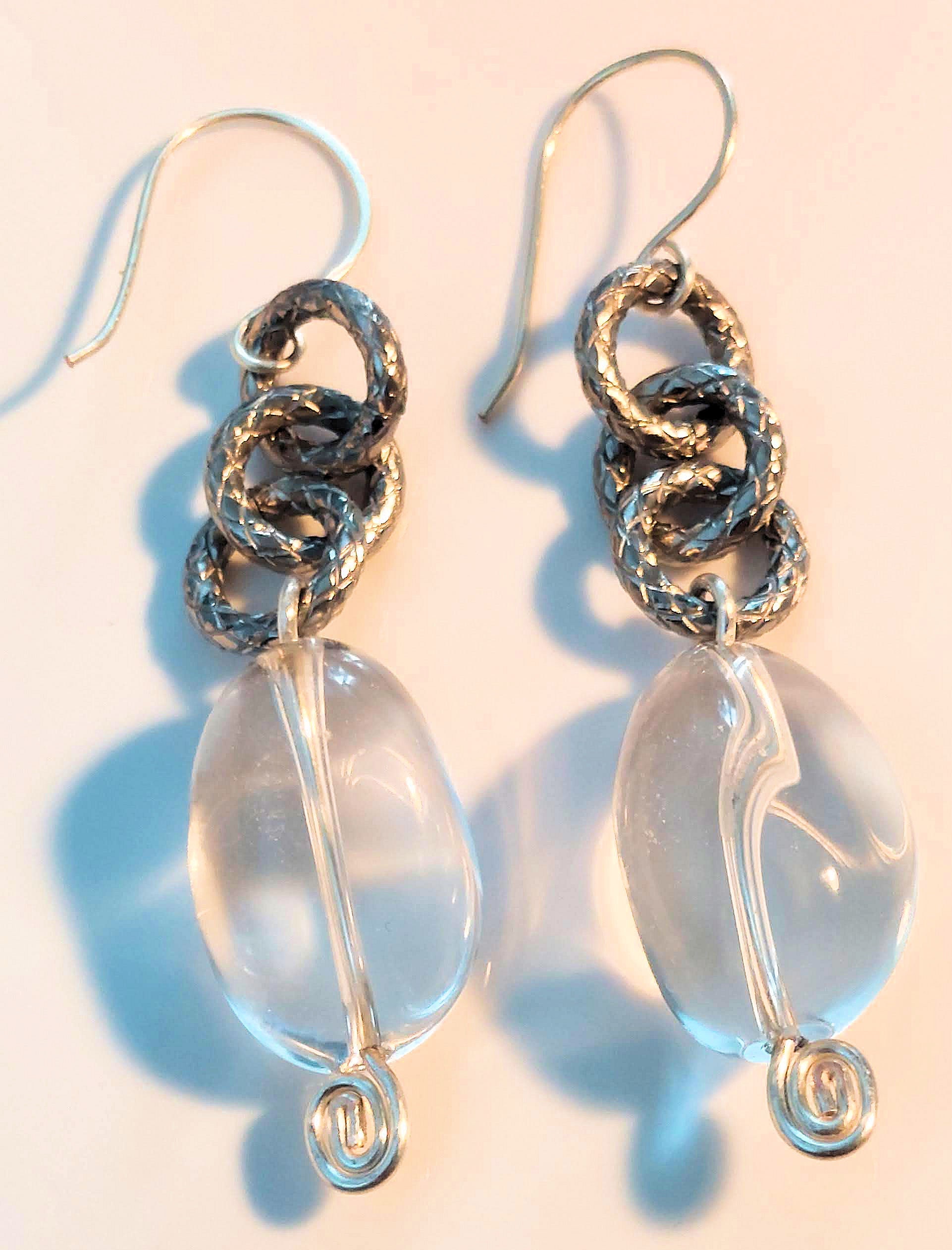 Cool, polished, clear asymmetrical quartz stones are the centerpiece of these pretty earrings. Suspended by chunky, diamond-cut stainless steel rings, the smooth icy quartz stones are gorgeous and feature a silver wire spiral dangle. Classically elegant, they look amazing for any special occasion and lovely worn with the matching pendant necklace. With handmade sterling silver ear wires, they measure 2-1/2" long.