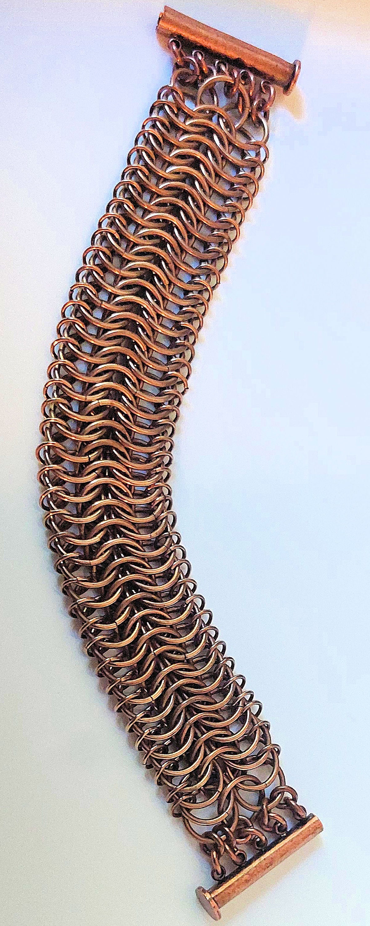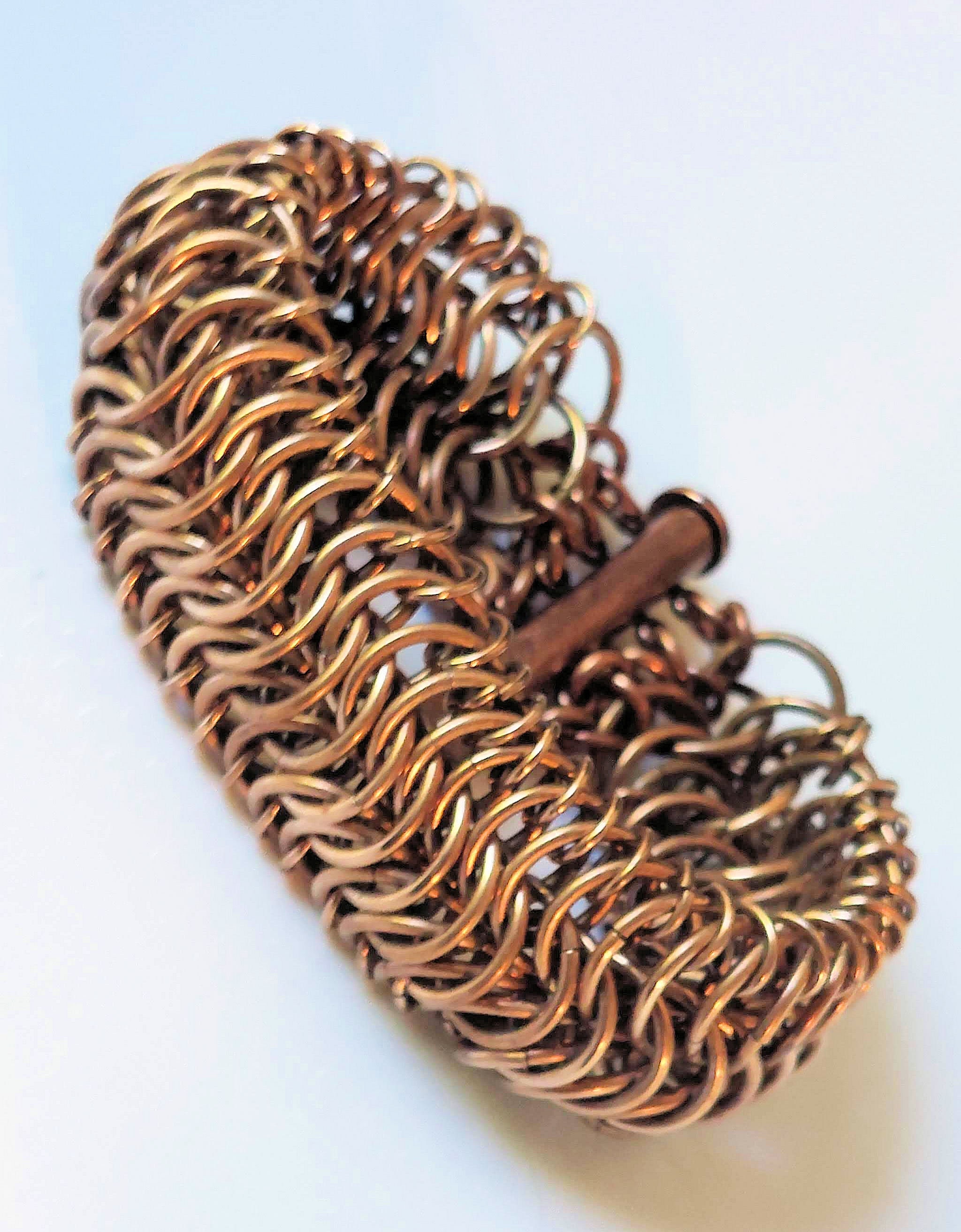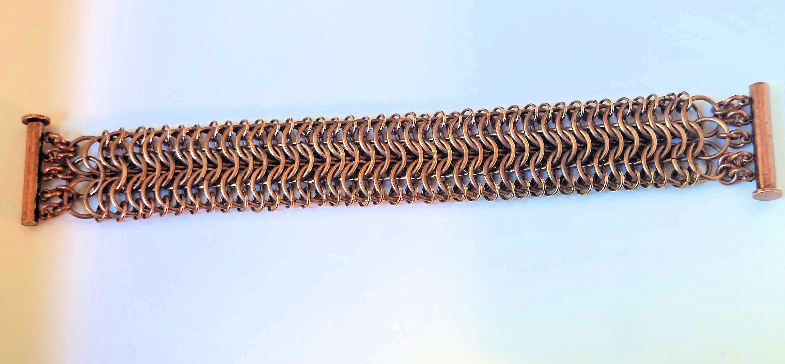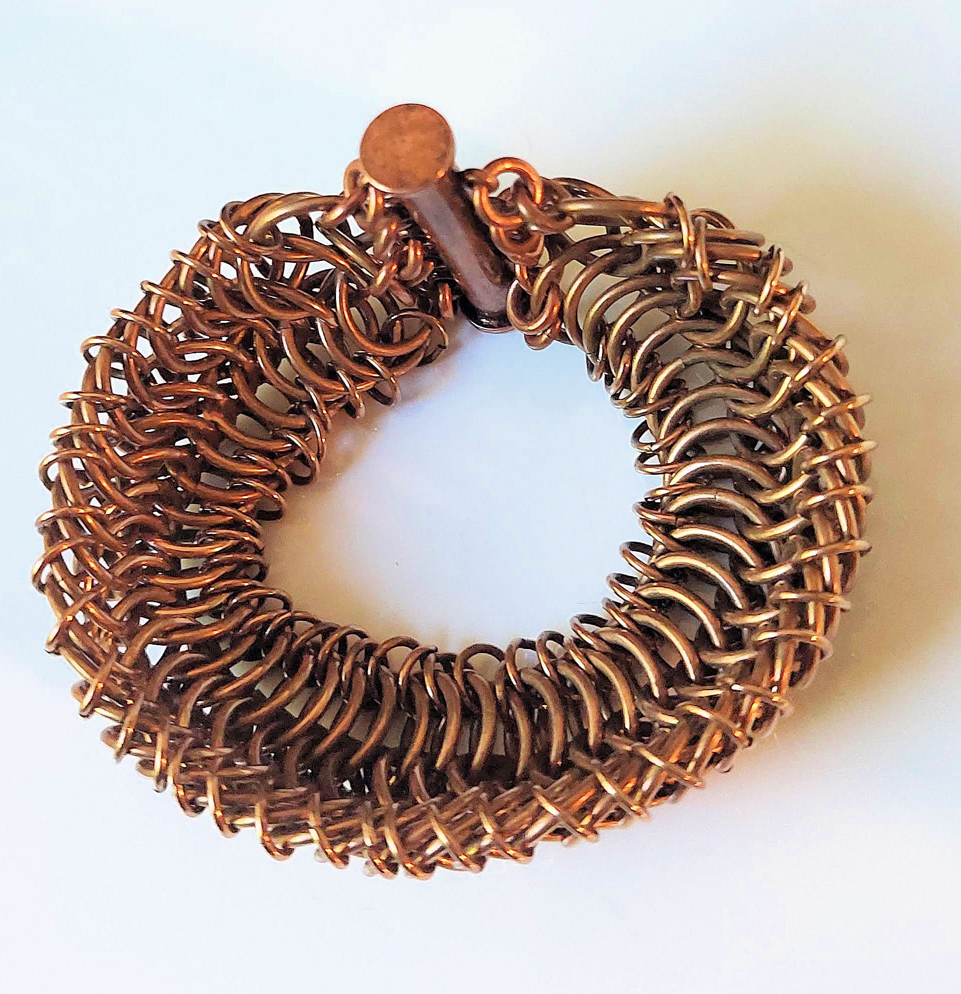 Our densely woven, intricate-looking 8-in-1 bronze European chain maille cuff is one-of-a-kind. The cuff is 7-1/4" long and 1" wide, securely closing with an antique copper magnetic slide clasp. Slinky and eye-catching bathed in a rich bronze hue, this statement piece is the perfect finishing touch. Dressed up or down, this conversation starter looks great with anything you dare to pair it with.