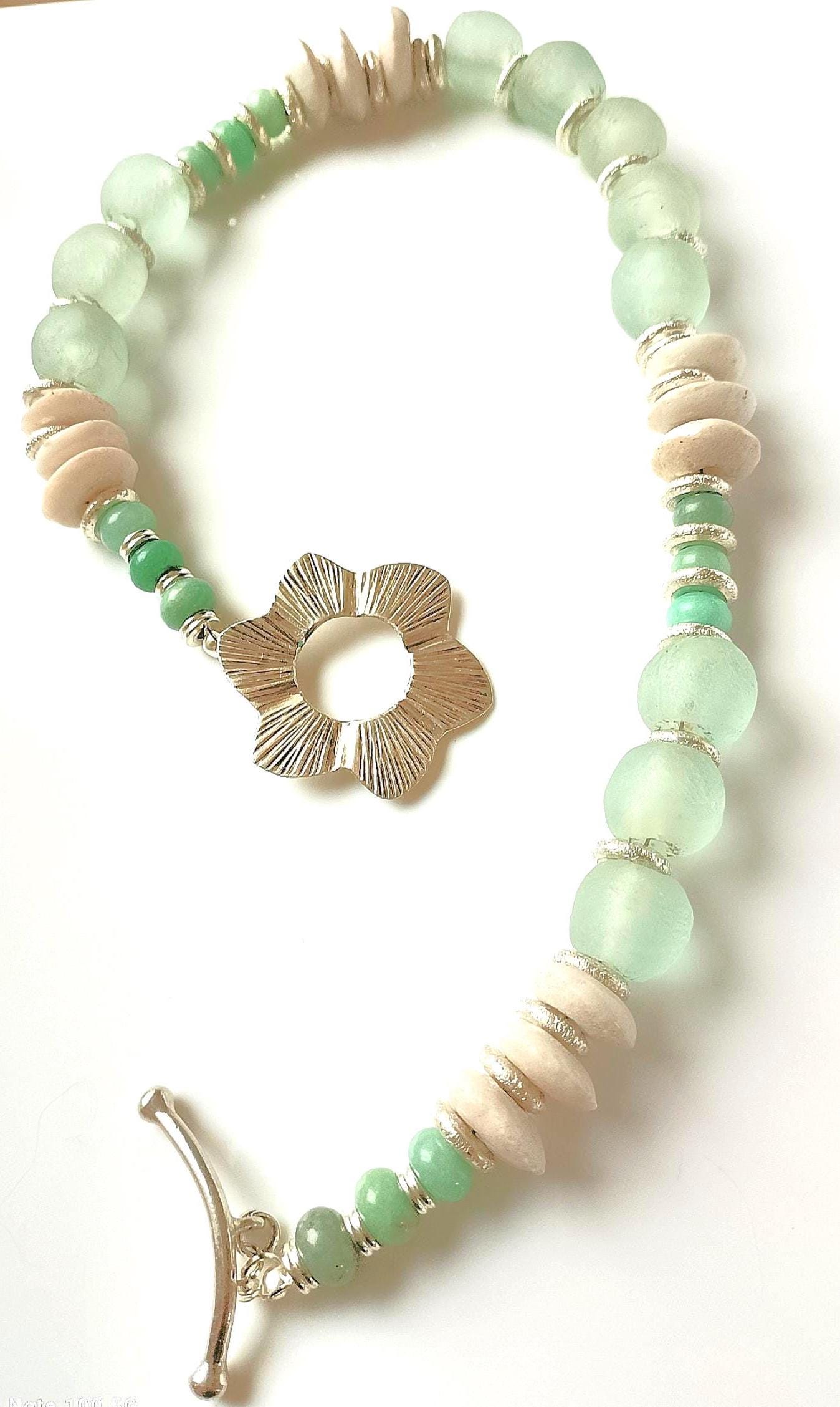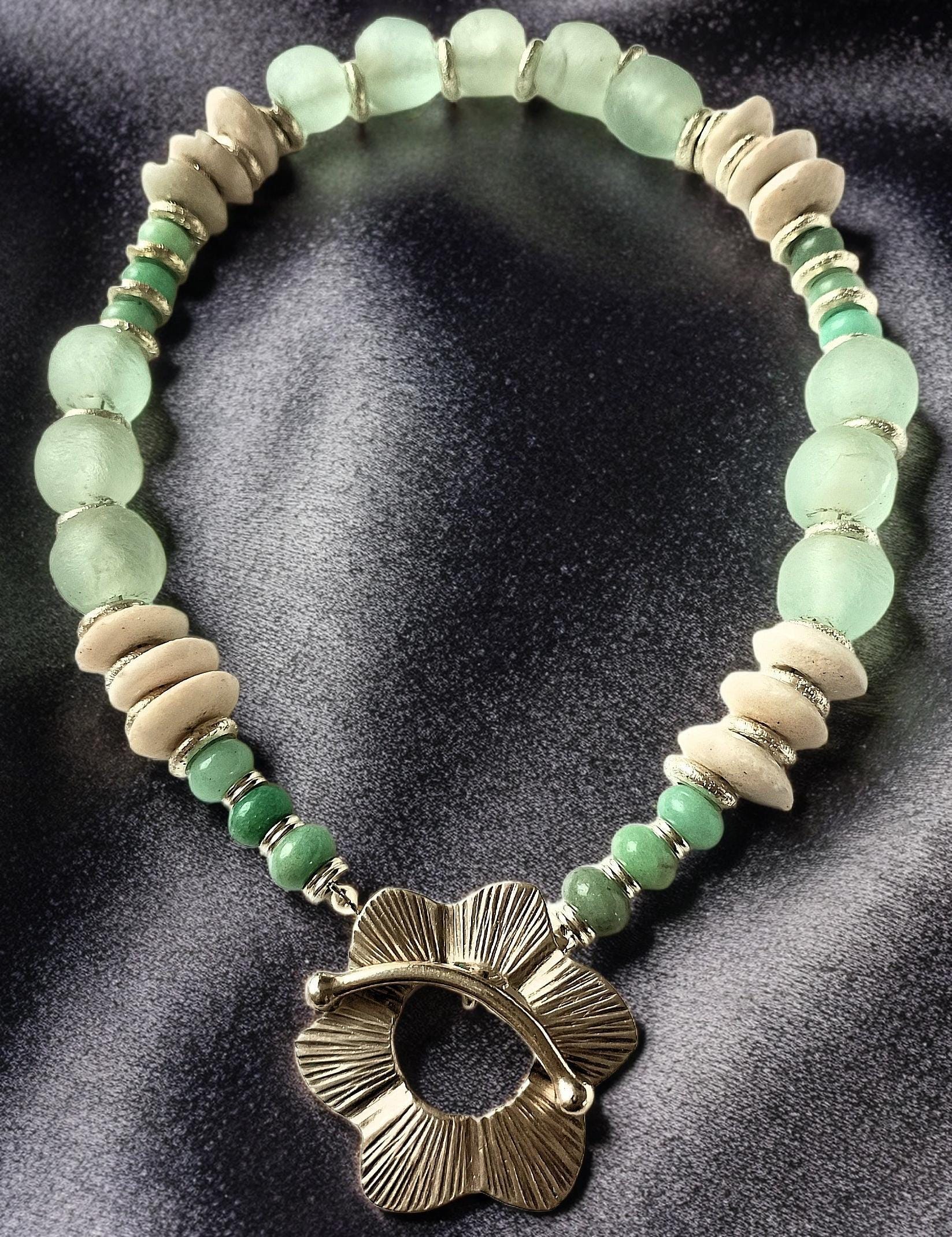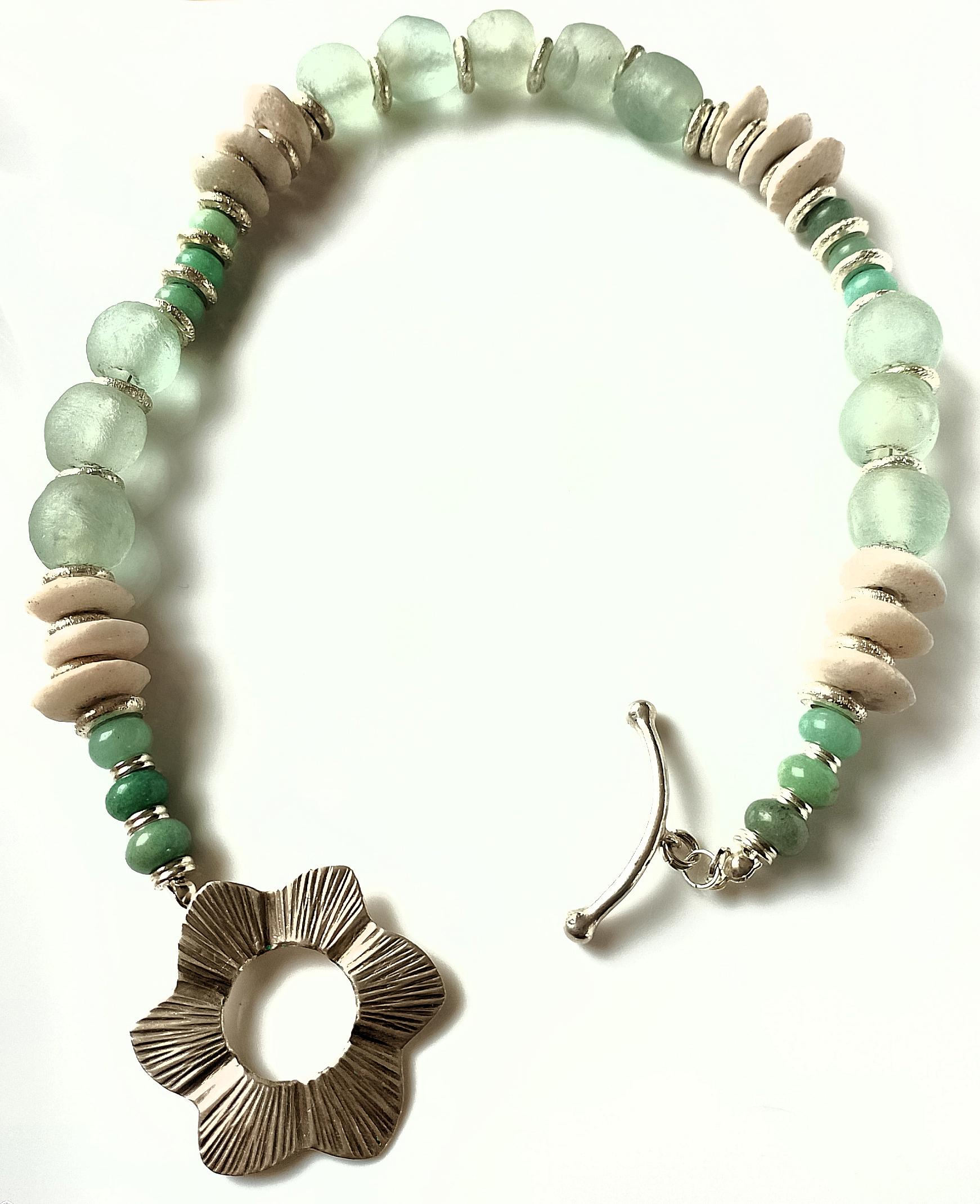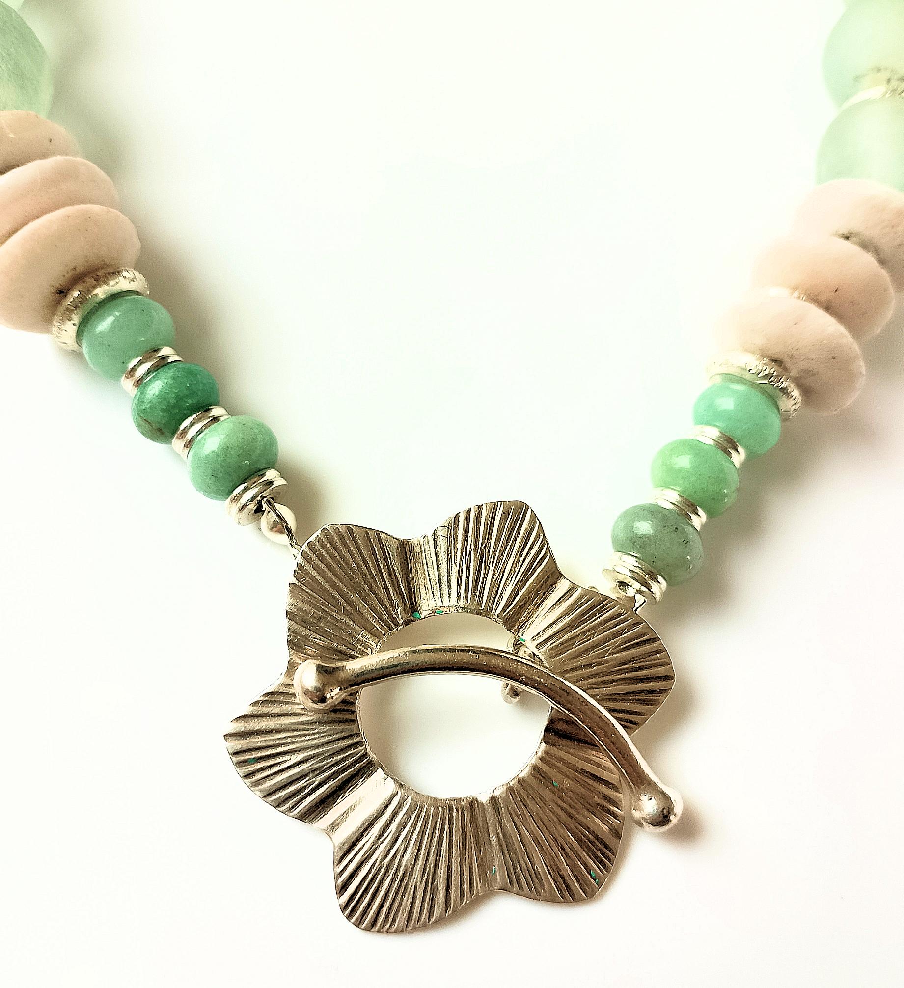 This exquisite choker necklace features authentic, recycled African beads crafted by the Ashanti and Krobo People of Ghana, complemented by gorgeous Amazonite rondelles. Meticulously crafted with white artificial sinew for exceptional drape and longevity, this substantial piece is finished with sterling silver findings throughout. The distinctive .999 fine silver Hill Tribe Silver Flower toggle clasp adds a touch of refined luxury to its beachy, exotic aesthetic, and the choker is designed to wear it with the clasp front and center. But it looks great with the clasp at the back or side, as well. This quintessentially feminine accessory will effortlessly elevate your look, particularly when paired with your favorite summer dresses and linen wear.